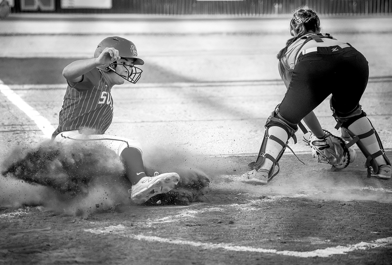 PHOTOS BY ALISHA WHITE Above left, Sulphur’s Paige Collins makes solid contact with this pitch during the Lady Bulldog’s, 6-3 loss to the Newcastle Lady Racers last Thursday. At right, Sydnie Rolin fields a pitch in the outfield for a throw into the infield in that narrow loss. Below, Sulphur’s Zoli May slides into home for a run in that game.