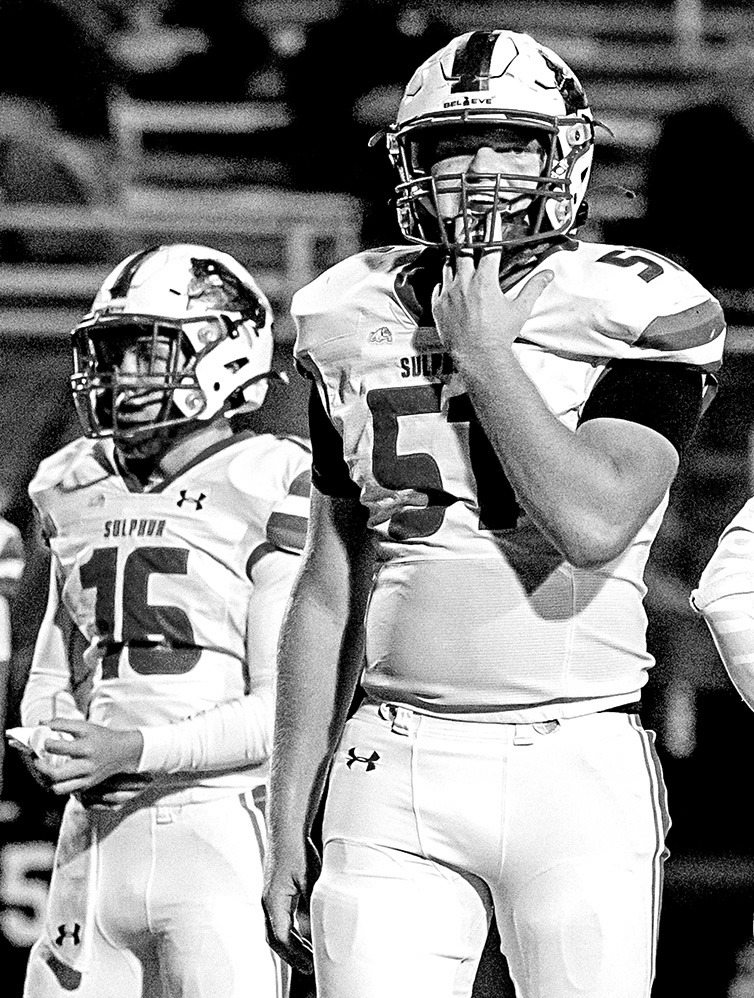 Brothers Aylor, left, and Acer Dixon see action in the Dog’s win at Victory Christian last Friday. The two are grandsons of the late Sulphur football coach, Jim Dixon. PHOTO BY BLAKE SEALE