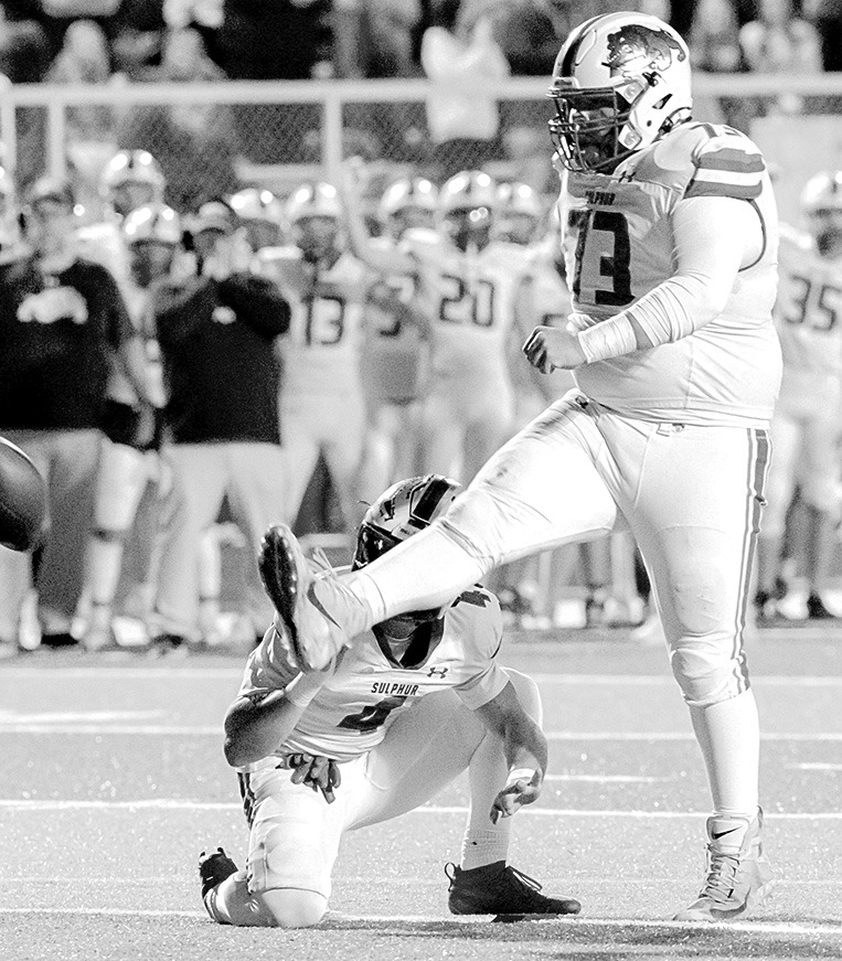 Sulphur junior Harley Peters kicks his first career extra point as the Dogs stormed past Victory Christian last Friday, 59-0. PHOTO BY BLAKE SEALE