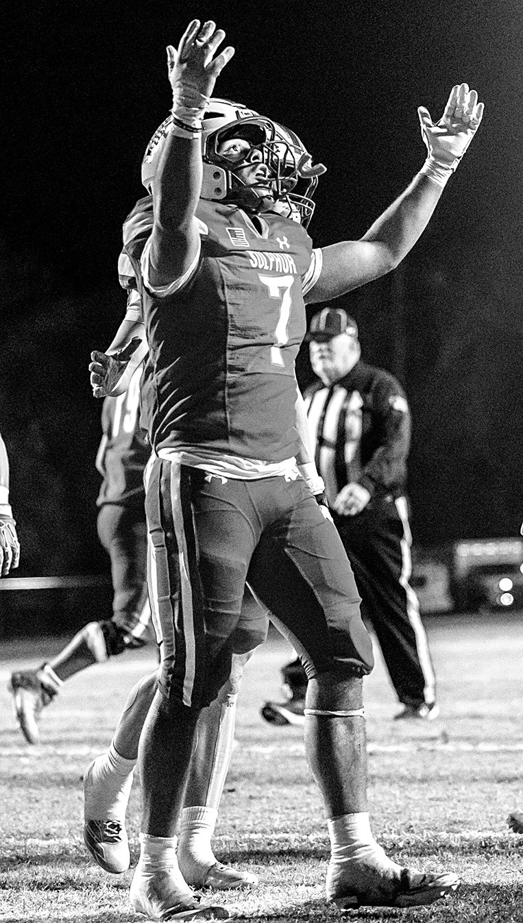 Sulphur running back JoJo Gray celebrates after scoring a touchdown in the Bulldog’s win over Holland Hall on November 21. The junior rushed for 163 yards in the game. PHOTO BY BLAKE SEALE