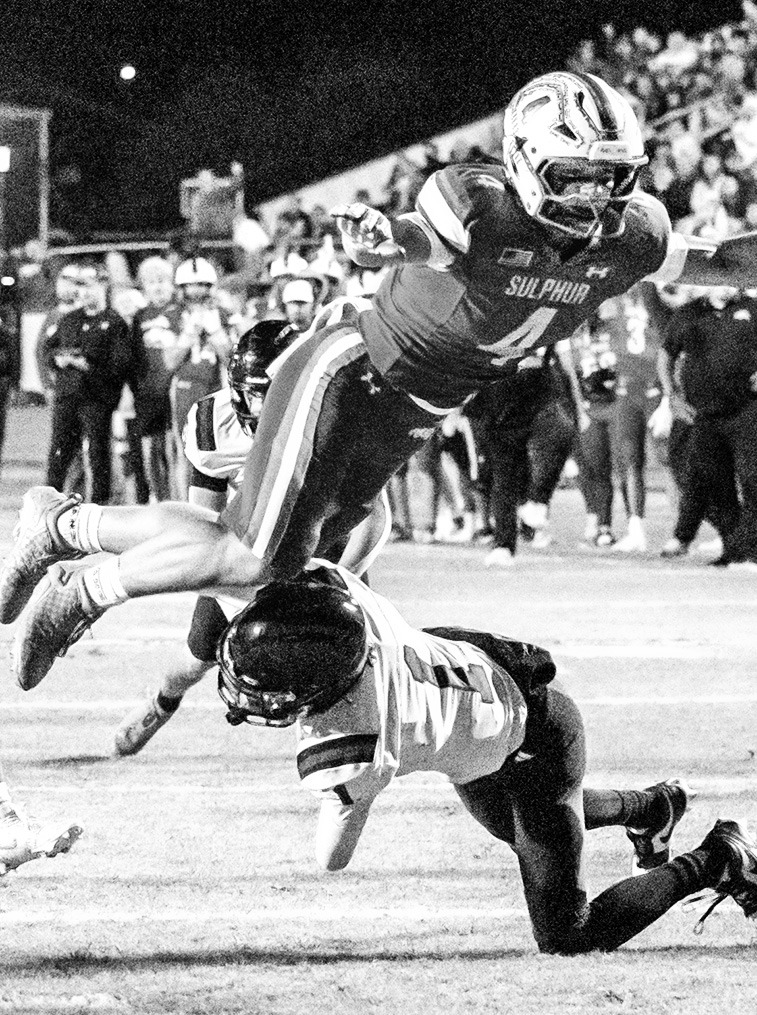 Sulphur’s Maddax Mobly (4) leaps over a Holland Hall defender in a win last November. Mobly recently was named to The Oklahoman’s All-State football roster. PHOTO BY BLAKE SEALE