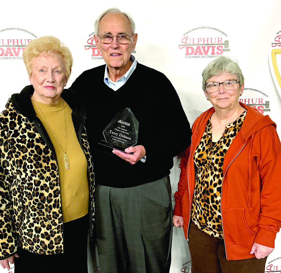 Sulphur’sTerry Dobson, center, was named the 2025 De Lannom Citizen of Year. He is flanked by the wife of the award’s namesake, Ruth Lannom, left, and the couple’s daughter, Deanna Elliott, right. The award was among many handed out last Thursday at the annual joint Sulphur-Davis Chamber of Commerce banquet.