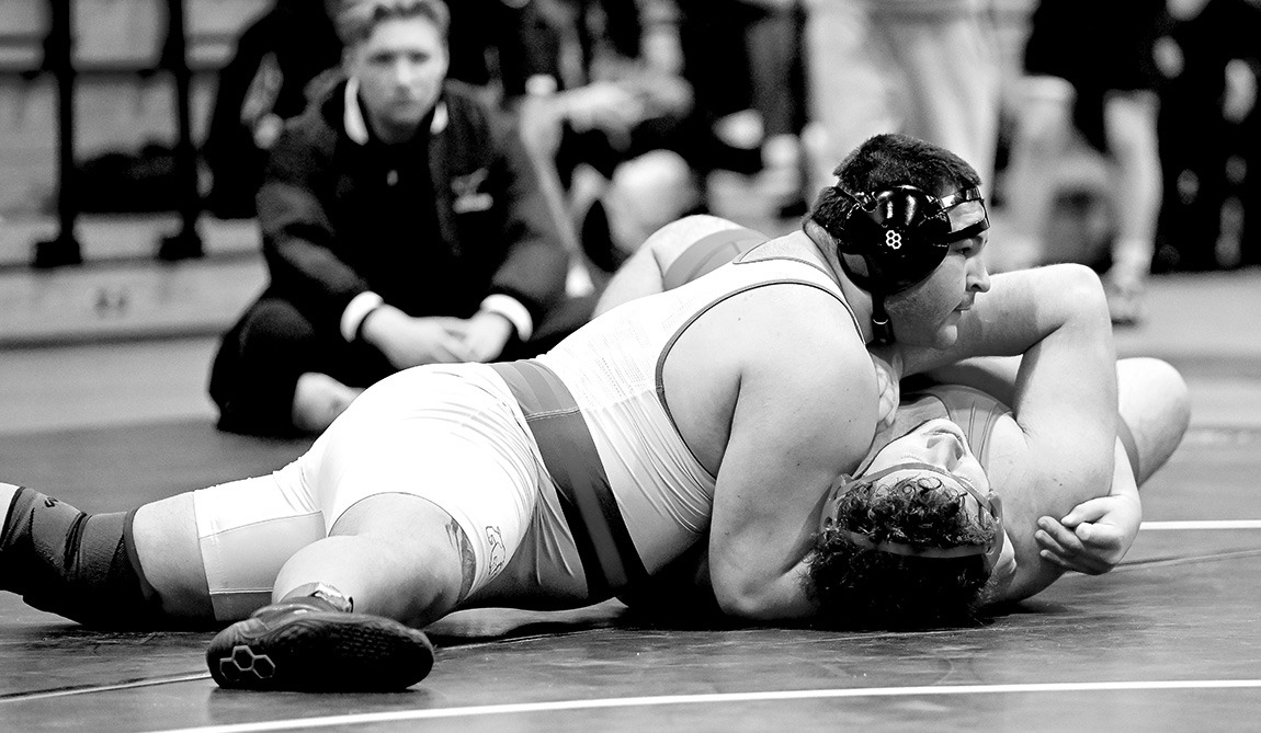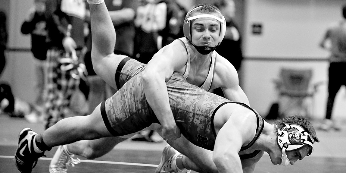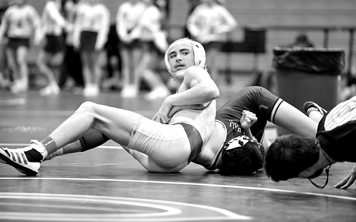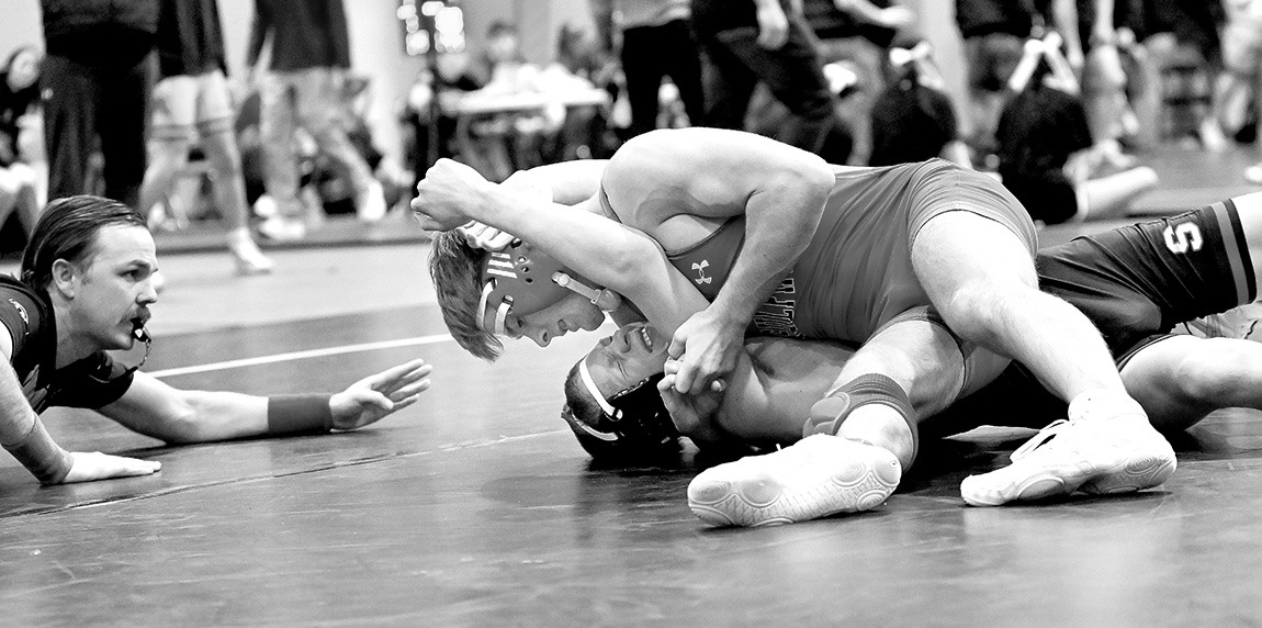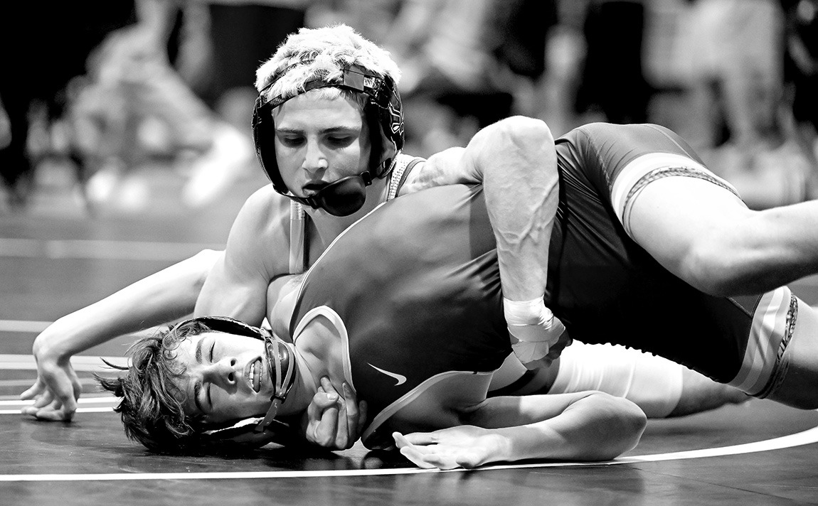 Tristan Barnes (126), in left photo on top, and Brody Wallace (285), in right photo on top,maneuver to pin their opponents in last weekend’s regional meet.