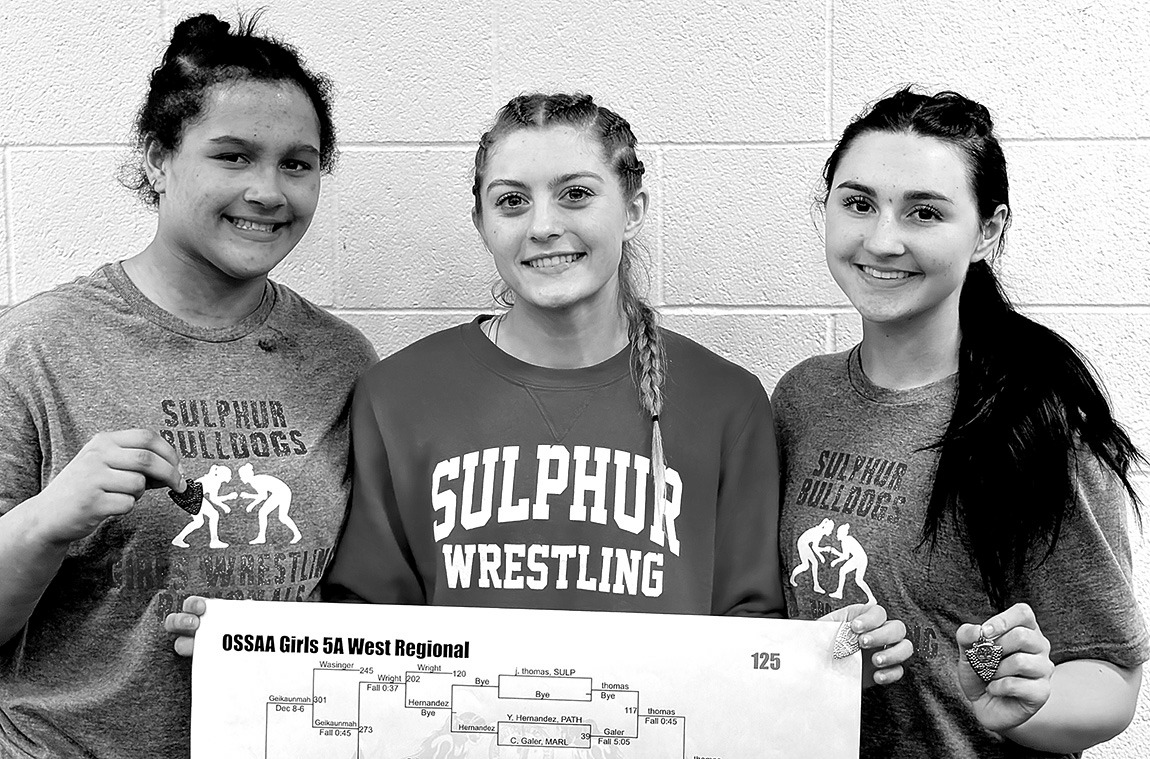 Three Sulphur High School girls qualified for this weekend’s state wrestling tournament in Oklahoma City. The there are, from left, Parker Wynn, Jolee Thomas, and Bintlee Burch. The three qualified at last week’s Class 5A West Regional meet in Weatherford that included a total of 44 teams. Thomas captured first place in the regionals, wrestling at 125 pounds, while Wynn was second at 190 pounds and Burch was fourth place at 145 pounds.