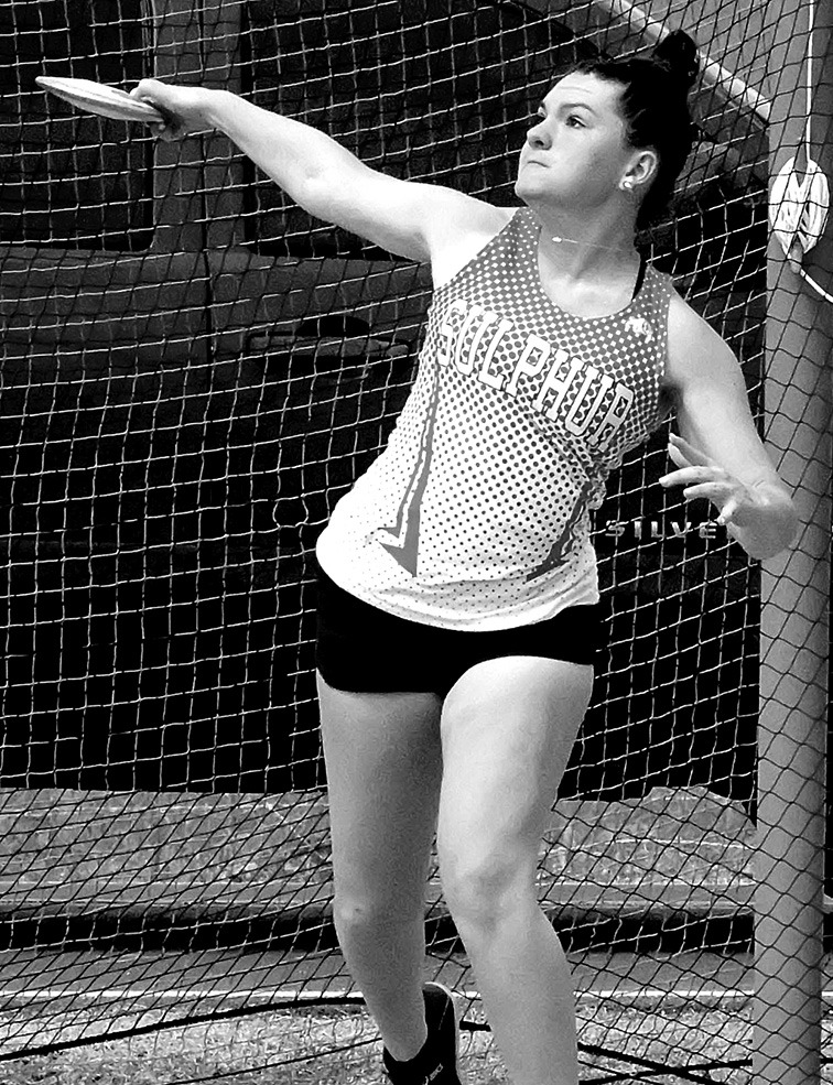 The Dog’s Morgan Brown, above, and Kenleigh Johnson, right, were among a host of top performers for Sulphur in last Friday’s Plainview Invitational track meet. Brown scored a second in the 3200-meter run, and Johnson picked up a third place in the discus. PHOTOS BY DON COFFEY