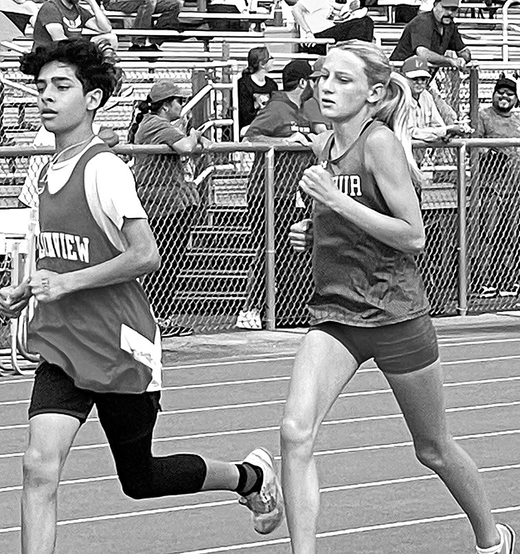 Sulphur junior high runner, Hensley Jarman, right, broke a 33-year-old school record in the 3200-meter run in last Saturday’s LCC Track Meet in Madill. She ran a 12:03 time.