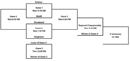 Graphic above shows teams in the regional baseball tournament in Sulphur Wednesday and Thursday, April 29-30. Sulphur will host Madill in game 1, set for an 11:00 a.m. Wednesday start. Woodward and Kingfisher will be next at 1:30 p.m. Other games are set for later Wednesday and Thursday.